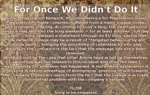 So, when I said Sony has ended all speculation, I was really only half-correct. Sony is still not naming the party responsible for the breach, so the speculation will likely continue. (Can you hear the blogosphere cheering?) Anonymous has prior beef with Sony and has attacked the company before, so it’s not surprising many blamed them for the service disruption. (You can read more about Anon’s prior grievances with Sony in yesterday’s post.)