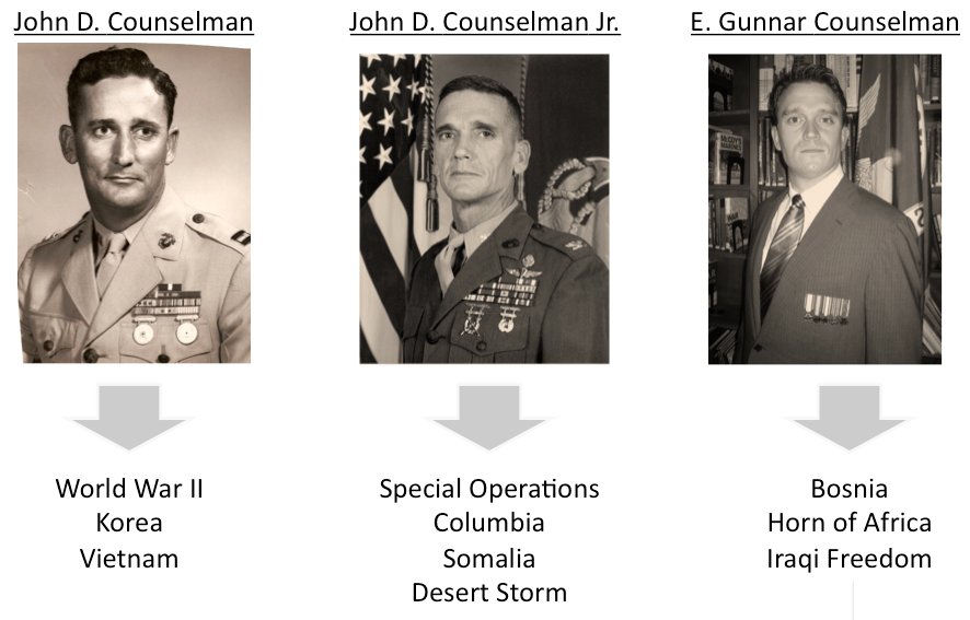 Of course, Counselman knows this all firsthand as a third-generation marine. He served in Operation Iraqi Freedom, his dad served in Colombia, Somalia and Desert Storm, and his grandfather served in World War II, Korea and Vietnam. After his discharge, Counselman headed to Harvard Business School.