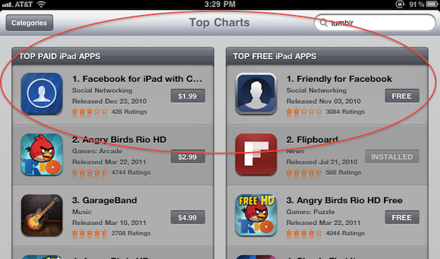 The other day I was browsing through the App Store on my iPad when I noticed something: both the top free and top paid applications for the device were apps for accessing Facebook. And as I kept going down the top apps lists, I kept seeing Facebook apps. In fact, of the top 40 apps (free and paid combined), a full 7 of them were ways to use Facebook on the iPad.
