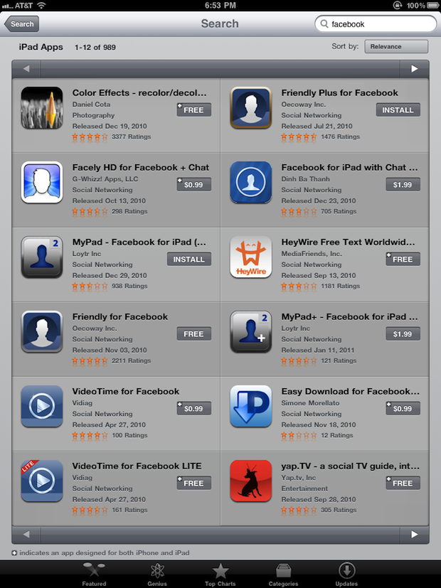 Facebook has come down on this type of brand-jacking in the past in the App Store. But it keeps happening because there is so much demand for a Facebook iPad app. A search for “Facebook” in the App Store on the iPad brings up 989 results. Some are simply apps that use Facebook Connect and have it in their descriptions, but many of them are apps designed solely to give users a native app Facebook experience. And many do subtle things to try and trick users into thinking that they’re official apps.