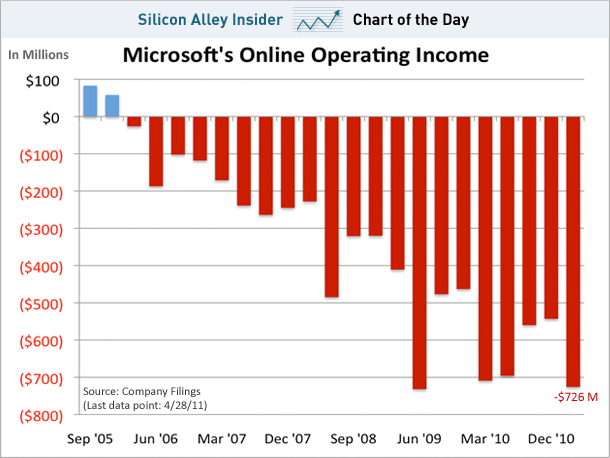 Microsoft lost $726 million in the Online Services Division for the quarter. It was actually their worst quarter in two years in that regard. And it was their second worst ever, as Business Insider points out in their nifty chart perfect for showing such bloodbaths.