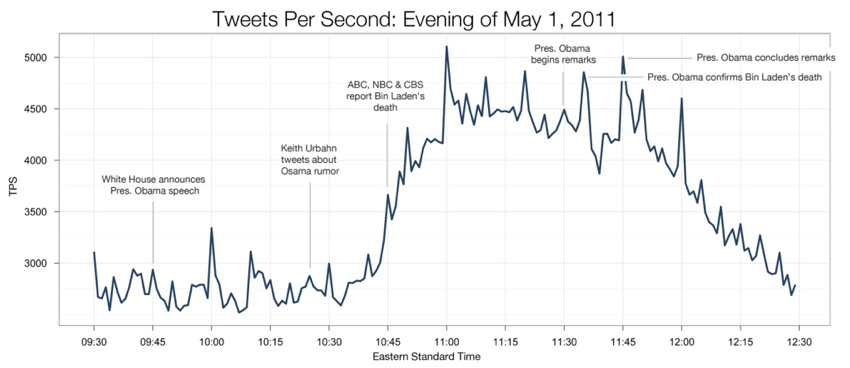 Twitter has just revised its preliminary measurements of 4,000 tweets per second from last night’s announcement of Osama Bin Laden’s death, tweeting out the new measurements below. At the event’s peak (11pm EST) there were 5,106 TPS, beating out Super Bowl 2011 (with 4,064 TPS) but not NYE 2010 (with 6,939 TPS).