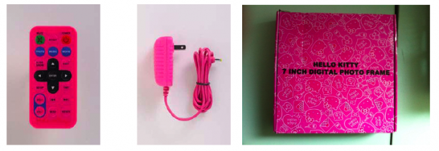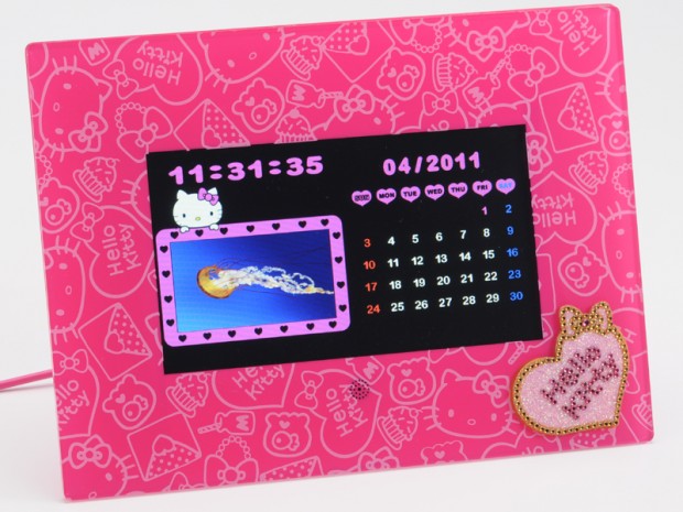 The frame is compatible to the following formats: JPEG, BMP, GIF, TIFF, MP3, WMA, MPEG-1, MPEG-4, and Motion JPEG. More importantly, it features not only Hello Kitty on the body but also comes pre-installed with icons, a calendar, a watch and other content showing Hello Kitty.
