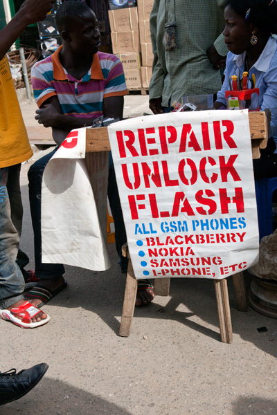 In Lagos, we could tell we were getting close to Computer Village because of the rows of parked trucks of busted out boom-boxes, televisions and other has-been electronics being fixed and rehabed for parts. Hawkers try to get your attention with a sound that’s a combination of a kissing-noise and a hissing noise. It surrounds you as you walk through Computer Village, making you feel like you’re either walking past a rowdy construction site or a den of snake charmers. That’s a good way to describe the sales tactics too.