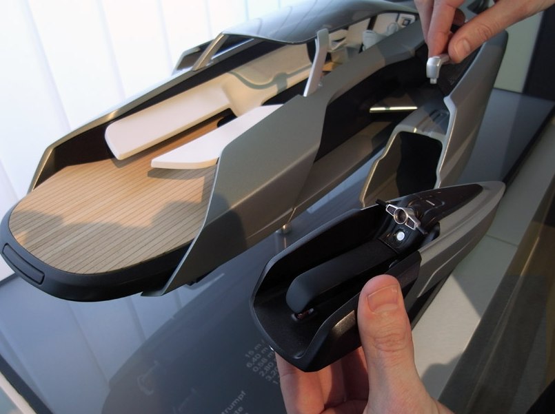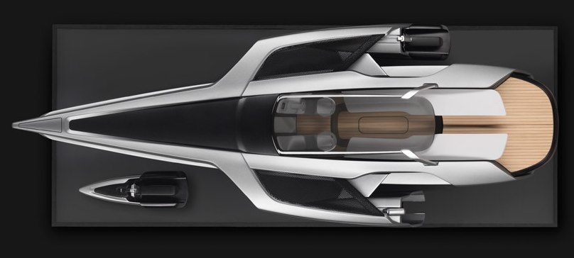 A jet ski attaches to either side of the main hull, helping stabilize the boat. While the jet skis are electric-powered, the 49-foot long watercraft is also powered by two diesel engines that use Audi’s turbo-charged injection technology. Audi’s Concept Design team in Munich worked with Behringer on the project.