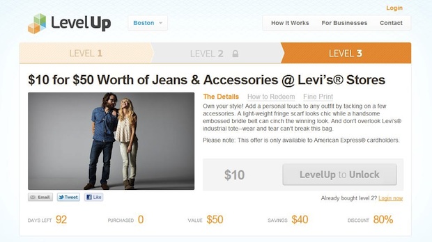 In conjunction with the news, LevelUp is also announcing that it’s landed Levis as its first national brand to use the service. Levis is offering ‘$10 for $20’ at Level One, ‘$10 for $30’ at Level Two, and ‘$10 for $50’ at Level Three. LevelUp is currently only available in Philadelphia and Boston (the service plans to open in more cities this summer), but Levis is temporarily offering the deal in San Francisco as well.