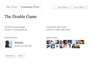 “Community Picks” is a new area of the Longreads website which scans Twitter for the most tweeted (and retweeted) Longreads articles. It then displays these on the website ranked by either most popular or newest. This adds another layer of stories on top of the traditional stock of Longreads editors’ picks.