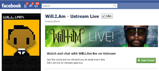 One of the first to give the new Ustream for Facebook app a whirl is Black Eyed Peas front man Will.I.Am, who will be broadcasting live on Facebook today at 2PM Pacific time.