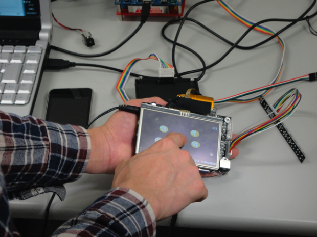 The device looks pretty hacky at this point, but it apparently works. It has an electrical tactile display on the back that receives the tactile information from the touchscreen, for example when you push an icon on the display.