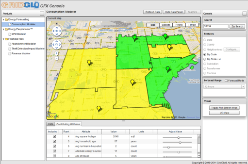 2. A map that color codes different zip codes based on the energy that households in the area are consuming. Attributes contributing to the model (e.g. average square footage, average household size) are shown in the lower panel.