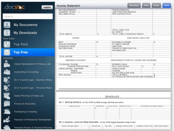 The iPad App, which is free, includes access to documents that are shared on the platform, including both premium and free content. Users have access to over 10,000 business and professional documents, and can also search and download over 20 million library documents. Content includes company business plans, proposal letters, real estate purchase forms, LLC operating agreements, marketing plans,and more. You can also integrate your saved, bookmarked and uploaded documents from the web on the app through your account.