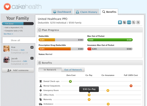 The company was founded by Rebecca Woodcock and former TechCrunch developer Andy Brett, who walked me through an early version of the service. During the initial signup process you’ll be asked to connect with your healthcare provider’s website. Assuming your provider is supported (it has around seven in California so far) Cake will pull in your recent claims for each family member, how much you’ve paid out of pocket, and your progress toward meeting your deductible. The service will also look at what your benefits are and make suggestions accordingly — if you’re eligible for two dentist visits per year and haven’t gone yet, it’ll let you know.