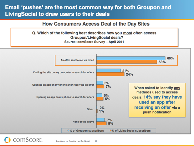 According to comScore’s State of Retail webinar, these notifications seem to be working — While 5% /6% (Groupon/LivingSocial) of users surveyed said that they open their respective apps to actively search for offers, 14% said that they engaged with the app, i.e. viewed the deal, searched for deals or purchased offers after seeing a push notification. That’s double the engagement with minimal development effort.