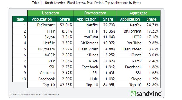 That puts Netflix above HTTP websites (18 percent), BitTorrent (11 percent), and YouTube (10 percent) as a source of downstream traffic during peak times in North America. (BitTorrent still accounts for half of all upstream traffic). As whole, “real-time entertainment” (which is mostly video streaming, but also includes streaming music) accounted for 49 percent of downstream traffic in March, 2011, versus 19 percent for P2P file sharing, and 17 percent for Web browsing.