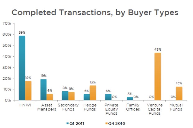 The biggest buyers were high net-worth individuals, who accounted for 59 percent of completed transactions, compared to only 18 percent last quarter. VC funds stopped buying completely during the quarter, whereas the quarter before they made up a whopping 43 percent of completed transactions (with mutual funds making up another 13 percent).