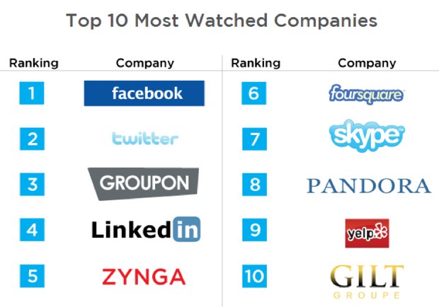 The most coveted private stock remains Facebook, which saw its valuation reach $75 billion on SecondMarket (and $85 billion on SharesPost). Facebook was the most “watched” company, followed by Twitter, Groupon, LinkedIn, Zynga, Foursquare, Skype, Pandora, Yelp, and Gilt Groupe—in that order.