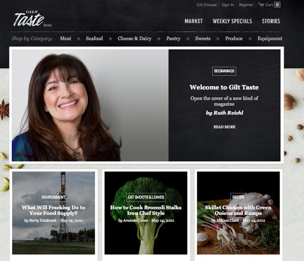 Earlier today, Gilt launched the latest addition to its group-buying sites with Gilt Taste—a very pricey online purveyor of produce, meats, fish, cheese, and other “artisinal” foods. While it’s easy to get distracted by the jaw-dropping prices ($50 steaks anyone?), the part I find interesting is that Gilt Taste is also an online magazine.