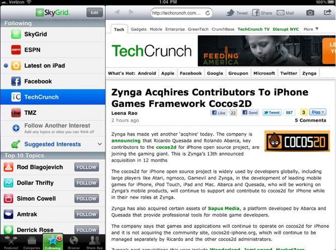 Now, you can filter your news stream on the app by following topics. You can follow topics like tech, and receive a realtime stream of news from tech news outlets. Skygrid even allows you to follow more detailed topics, like “Zynga games,” for users who want to access news about a specific topic. You can also now follow news sites like TechCrunch or The New York Times. And the app has deepened its social integrations, giving its users the ability to add your Facebook, Twitter or LinkedIn streams to the app. The new version of the app includes a more seamless browsing experience with one box to search and navigate.