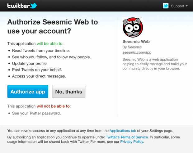In addition to the new DM permission level, the app permissions screen (above) will now give you more details as to what the third party app is allowed to do with your account, drilling down into specifics like reading tweets from your timeline, updating your profile and posting tweets on your behalf.