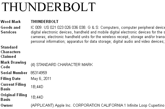 So why the trademark? My guess is that “Thunderbolt” is Apple-specific, since it uses Apple’s Mini DisplayPort form factor — and while other implementations are possible (Sony appears to be doing a USB-shaped one, like the prototypes), it could be that Apple is trying to push their version as the de facto standard.