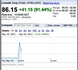 The company just reported that Q1 revenue in 2011 was up 110 percent to $93.9 million. Net income increased to $2.08 million, from $1.81 million in Q1 2010. LinkedIn says it will use the funds from the offering for general corporate purposes, including working capital, sales and marketing activities, general and administrative matters and capital expenditures. The funds could also be used for acquisitions or investments in complimentary technologies.