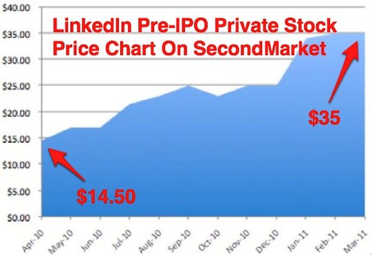 Now that LinkedIn has stock is trading publicly,, you can buy and sell shares of the company on the New York Stock Exchange. But its shares have traded before privately among wealthy individuals and other accredited investors on secondary markets such as SecondMarket. The chart above shows the price history of LinkedIn’s stock between April, 2010 and March 2011 on SecondMarket.