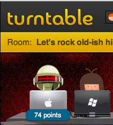 Everyone in a room has an avatar and can chat with each other. You can create your own playliist and get up on the DJ table to battle it out. People tend to talk a lot of smack. But it’s fun, and addictive enough that I didn’t leave after 20 seconds. Turntable.fm needs a lot of fine-tuning (in fact a lot of the chat was about features it coud use, such as better animations for the avatars or different ways to award points.