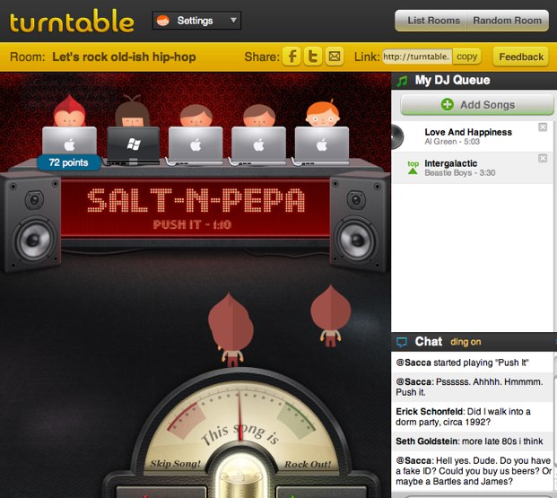 As it happens, I knew some people. Turntable.fm is a project of Seth Goldstein and Billy Chasen, the two guys who brought us Stickybits. You enter and there are different DJ rooms to choose from. There are probably 25 people there right now (this is still in private alpha). But in one room called “Let’s rock old-ish hip-hop,” there was Sacca, Goldstein, YouTube’s Hunter Walk, and Mike Marquez of CODE Advisors. Sacca was playing “Push It” by Salt-n-Pepa, up on the DJ platform (he gets to wear the space helmet because he has a lot of points, which are awarded to him by other people in the room who like what he plays).