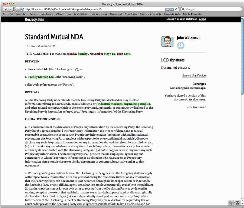 One of the winners at today’s TechCrunch Disrupt Hackathon is Docracy, an open source site where users can share and sign legal documents, similar to what GitHub provides for code. The site is the brainchild of mobile app developers Matt Hall and John Watkinson, who are the founders of app development startup Larva Labs.