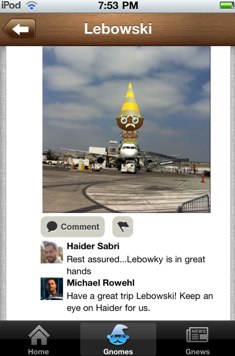 Gnonstop Gnomes is an open-ended experiment in social mobile gaming. Some people might send their gnome on a mission—to find the Eiffel Tower, for instance—and see if it gets there. Others will just take random pictures of gnomes. The ability to pass along the gnomes could lead to all sorts of interesting social dynamics. At the very least, a new meme is likely to be born. Get ready to start seeing gnomes everywhere.