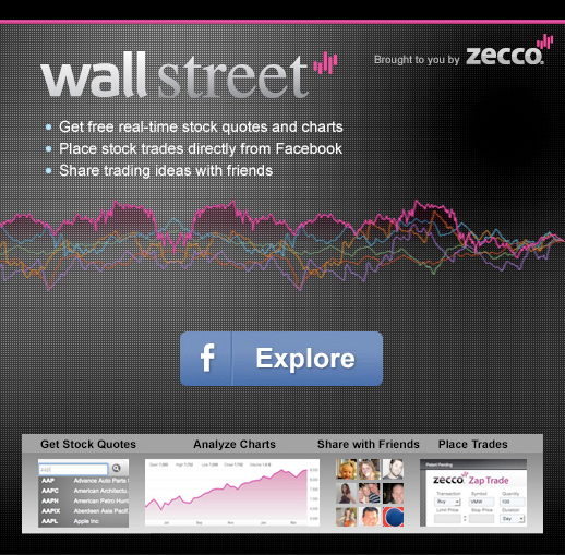 Today, live from TechCrunch Disrupt in New York, the trade-where-you-want-when-you-want parade continues, as Zecco launches the appropriately named “Wall Street”, which the company says is the “first and only” Facebook app to offer realtime stock quotes, charts, and community discussions on Facebook. And, my friends, not only that, but the Facebook app allows you to make stock trades directly from Facebook, using a compact trade ticket, without ever having to leave the friendly confines of Facebook.