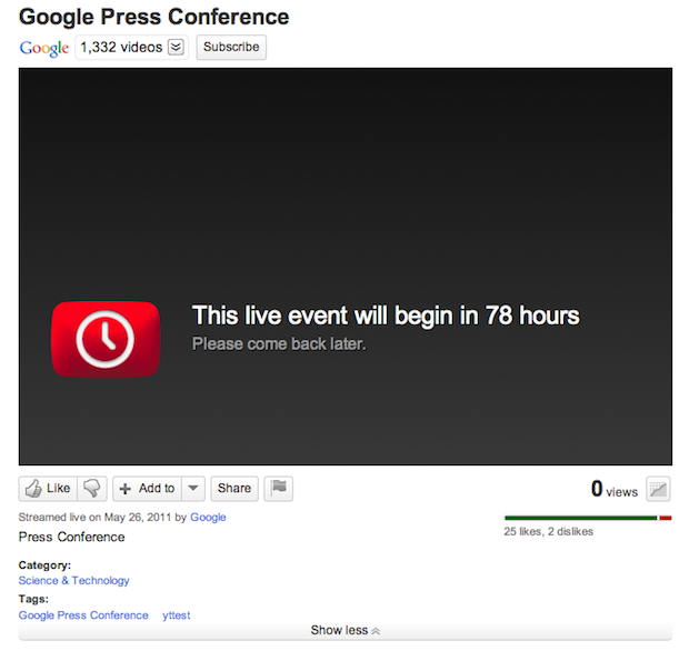 The reason we believe the accidentally live YouTube page was about the NFC announcement is because the dates line up. In the space where the video would normally be, the screen read: “This live event will start in 78 hours. Please come back later.” Below that, it read “Streamed live on May 26, 2011.”