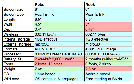 So the $130 Kobo is slightly smaller and lighter, while the $140 Nook supports images and supposedly has that great battery life. Then there are the intangibles. Which has the nicer interface? Which has social features you’ll actually use?