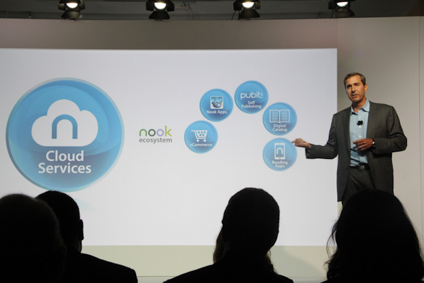 William Lynch on stage. Talking about advances in digital reading market. Nook momentum: 25% of the ebook market. Leading in physical book market at 17%. Nook Color is “Best tablet value in the market.” 2nd only in tablet sales to the iPad. Nook ecosystem. Well over 1 million apps downloaded.