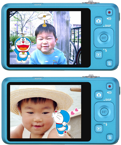 But obviously, the design is the main selling point here: buyers get Doraemon on the body of the camera, special on/off screens (see above), and a total of 9 Doraemon-related “virtual stickers” that can be included into every shot taken with the camera (see below).