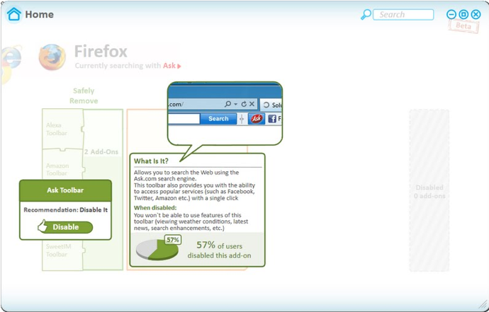 Today, the company is launching a tool for your browser that will show you which toolbars, add-ons and plug-ins are on your browser, what they do, and what they look like. With a single click you can remove unneeded ones. It also lets you revert back to your search provider of choice (Yahoo, Bing or Google) in case it was ‘hijacked’ by other software. The new tool will also show you what percentage of users removed each add-on or toolbars so users can determine if it makes sense to remove the plugun.