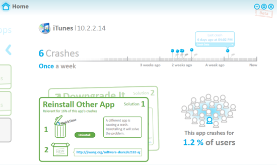 Another addition to the Soluto product changes the way you experience application crashes (that is, when applications unexpectedly ‘die’ and prompt Windows to send ‘Crash Report’ dialogs). Soluto analyzes application crashes against tens of millions of crashes already collected, and finds solutions to prevent them from recurring.