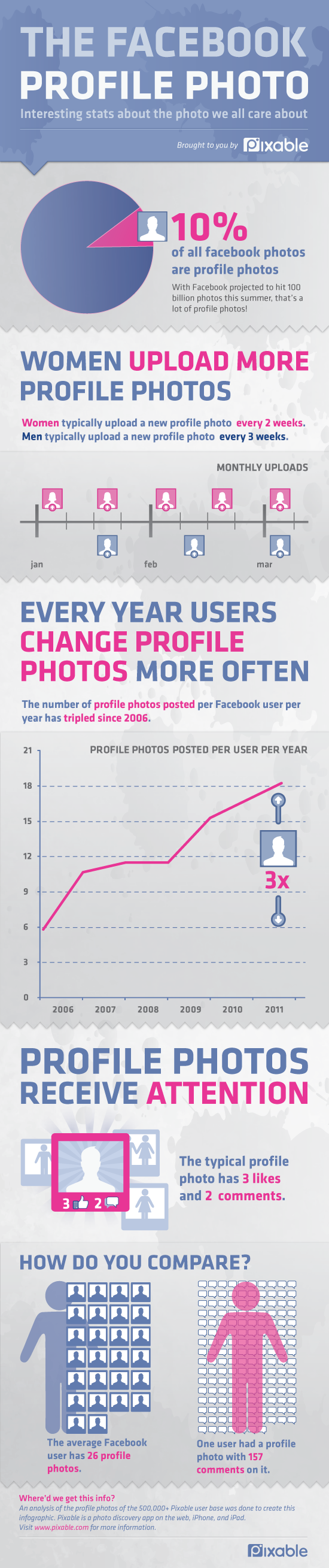 According to Pixable, 10 percent of all Facebook photos (which are expected to hit 100 billion photos downloaded this summer) are profile pictures. Women upload profile pics more often than men, with women uploading photos every two weeks compared to three weeks for men. And the number of profile photos uploaded per user has tripled since 2006. On average, the typical profile photo has 2 likes and 2 comments.