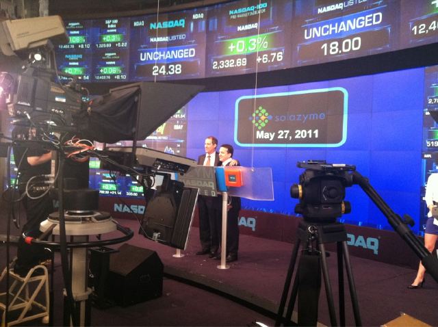 Image: Solazyme founders, Jonathan Wolfson and Harrison Dillon ring the opening bell at Nasdaq, courtesy of Solazyme [hat tip: Clean Economy Network]