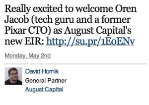 August Capital recently announced that Oren Jacob, CTO of Pixar has joined as their newest entrepreneur in residence. After a few weeks on the job, I got a chance to interview Oren and ask him how his new gig was going. In short, he has new-found respect for venture capitalists and button down shirts.