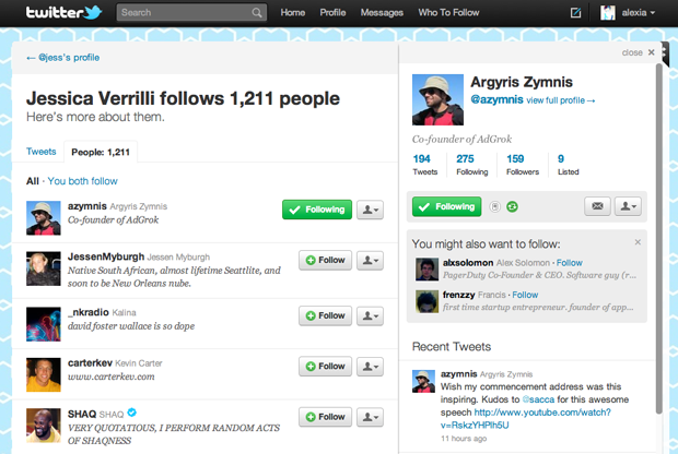 Fun fact about this particular grab: The last person Twitter corporate development executive Jessica Verrilli followed on Twitter was AdGrok co-founder Argyris Zymnis. Co-founder Antonio Garcia-Martinez has yet to return my calls.