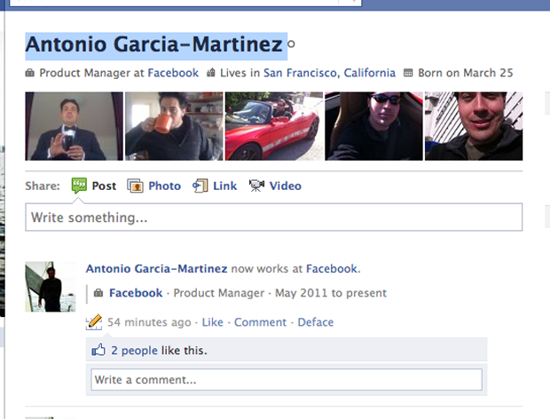 Garcia-Martinez has changed his title on his Facebook profile to Product Manager at Facebook. I have no idea whether this means Facebook won some acquisition battle or that Garcia-Martinez left the rest of the AdGrok team independently. In any case we’ll find out soon enough.
