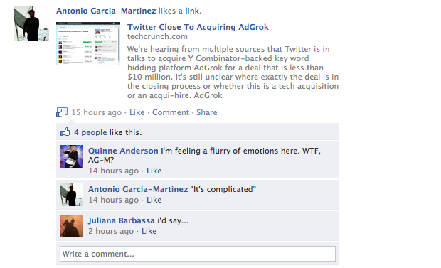 We’re hearing this split hasn’t exactly left both sides all warm and cuddly. The two other AdGrok founders, Matthew McEachen and Argyris Zymnis, will be joining Twitter. We’ve reached out to Twitter about the oddity and will update if we hear back. Garcia-Martinez posted our link yesterday to his own Facebook wall and when someone asked him what the deal was, he responded with “It’s complicated”. Well played.