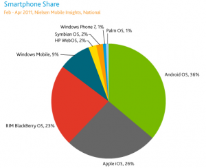 According to Neilsen’s May survey, not much has changed by way of smartphone operating systems in the past month. Android, iOS and BlackBerry OS are at a standstill, posting the same market share numbers they did last month. Android still controls 36 percent of the market, with iOS trailing at 27 percent, and BlackBerry OS rounding out the top three with a 22 percent market share. Down at the bottom of the barrel, HP’s WebOS, Nokia’s Symbian, and Microsoft’s Windows Phone maintained their single-digit market shares from last month, with Windows Phone leading at 9 percent.