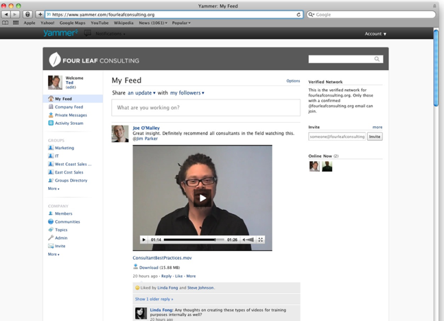 Now you can attach videos to Yammer messages (just as you would with a Word document or PowerPoint presentation), and then users can play the videos directly in the feed, comment, and like videos. Users can also browse all uploaded videos that have been added to a company’s stream and search for videos by keyword. Yammer says that the video player is HTML5 compatible and works in the web browser on the iPhone and iPad.