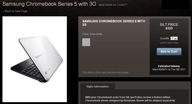 This is kind of a strange match. Samsung’s new Chromebook has hit Gilt two weeks early, according to an email sent to members of the luxury shopping site. No pricing was mentioned, but buying also gets you a special laptop sleeve from Rickshaw.