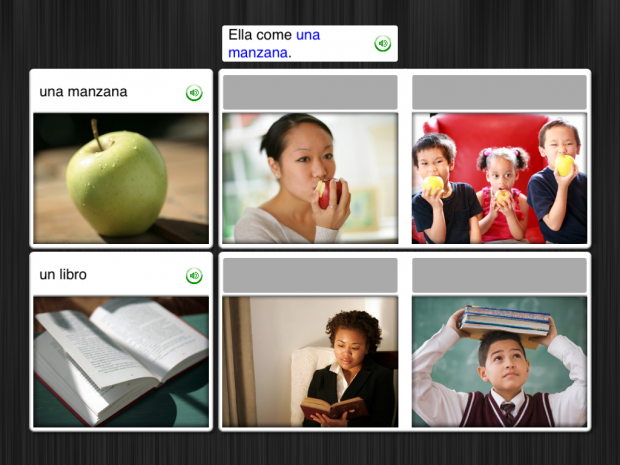 The Rosetta Stone app works the same way. Some pages ask you to choose the picture that best represents the word or phrase being spoken, gradually integrating new words that you haven’t learned yet. Other pages display a pattern of different ideas or sentences, and require the user to complete the pattern. For example, one page showed four different pictures with corresponding sentences: 1. I have red apples. 2. We have green apples. and 3. I have a red bike. Based on the first three sentences and their corresponding photos, the user must then figure out what the fourth sentence will be (We have green bikes.).