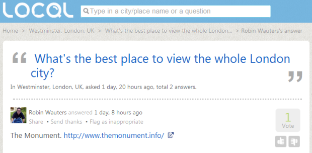 LOCQL users can vote on answers based on their quality and interact with other community members. Eventually, LOCQL should become collaborative community building an extensive database of answers about places, local businesses and whatnot, on a global scale.