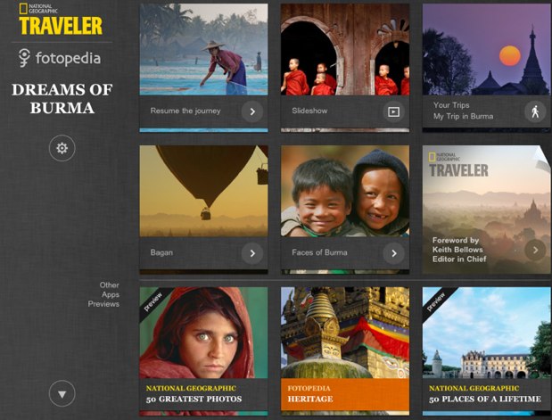 Dreams Of Burma brings together more than 1,000 images of the people and landscapes of Burma from Fotopedia photographers. The collection was both created and curated by the Fotopedia community, and then vetted by Fotopedia’s own photo editors and the editor of National Geographic Traveler. Like Fotopedia’s other iPad “photo books,” you can explore the images tags, swiping through, or shuffling for a random selection.