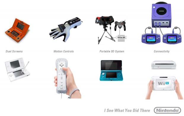 There’s seemingly a philosophy inside Nintendo that form factors and ideas don’t die, but rather are shelved and re-released once the proper technology is ready. The Wii U is just the latest in a long line of consoles that use rather old form factors and ideas. Just look at this chart we found on Reddit. The Nintendo Watch & Game spawned the DS 24 years later, the Power Glove preceded the Wii, the Virtual Boy the 3DS, and the Wii U now seems like a proper implementation of the GameCube/GameBoy Advance controller scheme. Not that there’s anything wrong with this process. It clearly works.